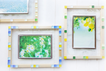 ガラス部分にサンドブラストで好きな模様を入れ、木のフレームを組み立てて完成です。フレームにカラフルなガラスのモザイクタイルでデコレーションもできちゃう!スタンドに立てて飾っても、金具を付けて壁にかけても楽しめます!お部屋を彩るおしゃれなインテリアに♪(サイズ:約21.5cm×16.5cm)