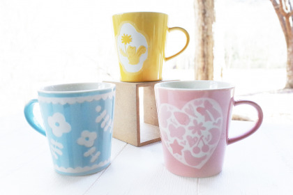 模様を砂で削るサンドブラストの新メニュー「春色マグカップ」です。春らしいパステルカラー3色を用意。使うたびに明るい気分になれちゃう♪好きな模様をサンドブラストしたオリジナルマグカップでほっこりティータイムを過ごしましょう!