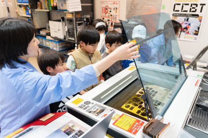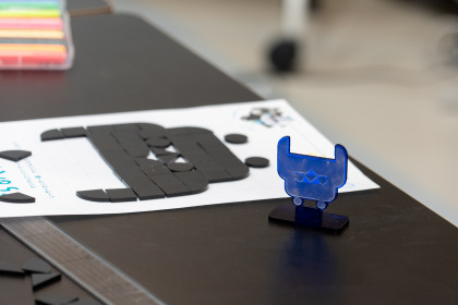 CCBTのロゴはシンプルな図形の組み合わせでできている?単純な図形でも組み合わせの工夫次第で様々なパターンのロゴをつくることができます。図形を組み合わせてオリジナルのロゴづくりに挑戦します。ロゴが完成したら、次はそれをアクリルスタンドへ展開。レーザーカッターでアクリル板をロゴの形にカット、彫刻し、オリジナルのアクリルスタンドの完成です!