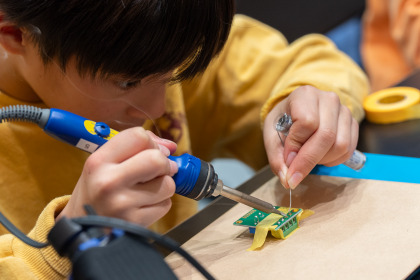モーターにいろいろな物を取り付けて速度や回転方向を変化させながら動かし、おもしろい動きや音を考えてみよう!電子工作が初めての人大歓迎!モーターの速さや回転方向を制御するための基板に電子部品をハンダ付けをして組み立てることで、自分のアイデアを実装する方法としての電子工作の基礎を学びます。