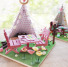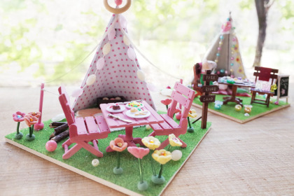 キャンプ用のテーブルとイスなどのミニチュアパーツと木のテントパーツ、さらに工房に用意してある様々な素材を自由に使ってジオラマを作りましょう!自分だけの理想的なキャンプ空間をステキに演出♪(べースの板のサイズ:17cm×17cm)