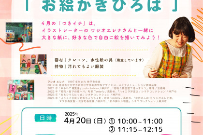 新開地アートひろば1階の「てててパーク」では、月1回のイベント「つきイチ」を開催しています。4月は、人気の「お絵かきひろば」。今回は、イラストレーターのワシオエレナさんと一緒!大きな紙に、好きな色で自由に絵を描いてみよう!