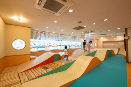 波形の床面やはしご状の通路など、子どもたちが遊びを生み出すきっかけとなるようなしくみが空間内に散りばめられています。遊びながら考え、考えながら遊ぶというプロセスを繰り返すことで、思考の柔軟性と想像力が刺激される子どもたちの場が山口に生まれます。