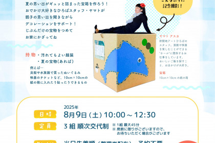 新開地アートひろば1階にある「てててパーク」では、月1回のイベント「つきイチ」を開催しています。8月は、「宝箱を作ろう!」です。夏休みに見た景色や行きたい場所を思い浮かべながら、夏の思い出がギュッと詰まった宝箱を作ろう!お出かけ大好きなひろばスタッフ・ヤマトが親子の思い出を聞きながらデコレーションをサポート!自分だけの宝物を詰めてお家に飾ってね