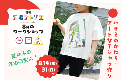 ①日本の伝統文化「手ぬぐい」を、カラフルな図形のコラージュで染め上げよう! ②夏休みテキスタイルデザイン体験! ③透明、キラキラ、くしゃくしゃ、いろんな素材の色んな形が風に揺れる