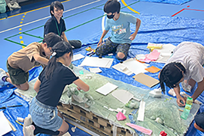 6〜8人のグループで協力しながら、自分が考えた“小さな世界”を形にし、それらをつなげて、“大きな世界(まち)”を完成させます。イメージを描き、透明な箱を使って立体の模型をつくります。完成したまちはライトで照らし、色の重なりなども観察!建築の楽しさや面白さを、みんなで体験!