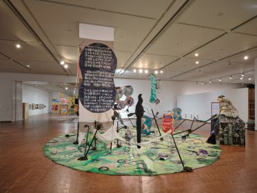 牛島智子《ひとりデモタイ 箒*筆*ろうそく》(2025)、「プラカードのために」展示風景、国立国際美術館、2025年