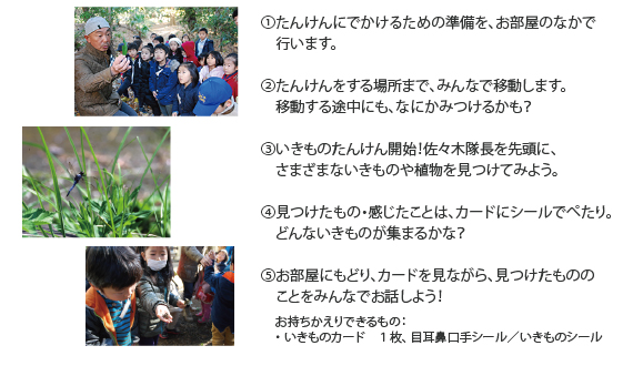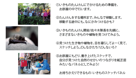 建物がたくさん立ち並び、多くの人が暮らす東京。いっけん自然がみあたらないような大都市のこのまちにも、ちょっと目をこらしてみてみると、たくさんの野生があふれています。 道端にめずらしい草が生えていたり、湧水がわいているばしょがあったり、野生の動物がたくましく暮らしていたり、、、。 生きもの探検のプロ・佐々木 洋さんを隊長に、たんけんたいを結成して、さまざまな生きものや、自然を探しながら、まちのなかの野生にふれてみよう! 自分の目で見つけたことをことばや絵にあらわしてみたら、自分だけの夏の研究もできあがるかも!? 準備をばっちり整えたら、いきものたんけんたい、出発!