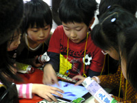 「えまきもん」道中に配置されているものたちを、こどもたちが考えて、デザインします。みんながデザインしたアイテムは、その場でプログラムに組み込まれ、ipadで見ることができます。