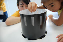 昔のアニメをみる機械「ゾートロープ」を使ってアニメ作りにチャレンジしました。 |