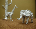「アルミホイルのアフリカ」 アルミホイルをぎゅっとにぎって、ととのえて、 いろんな動物のカタチをつくってみよう! みんなでつくった作品をあつめて展示すると・・・ ちょっとふしぎなアフリカのセカイが完成!