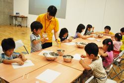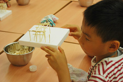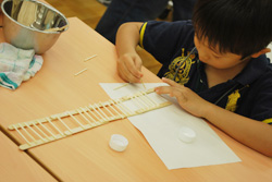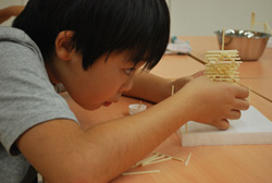「マッチ棒の構造」 構造って何だろう・・・。 辞書をみてみると、 「組み合わせる」、「しくみ」、「かたち」 って言葉が出てくるよ。 たくさんのマッチ棒をつかって、 「構造」をつくってみよう! 縦に長いカタチ、横に広がるカタチ、 なんだかわからないけど、面白いカタチ。 家みたいになったり、橋みたいになったり、 タワーみたいになったり・・・。 自分だけの「構造」をつくりながら、 きっといろんなしくみがわかってくるかも!? じっくりじっくり集中する時間を 研究所で過ごしてみよう!