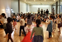 みんなの筆がひとつの点に大集合。そこから何が始まるかな?ゆっくりな線とすばやい線、どんな表情? 今度はお友達の点から線を引いてみよう。どんな風に描いたら楽しい?ゲームのようにお題を出し合いながら、"なにを描く"ではなく "どう描く"をとことんみんなでやってみます。せーの!