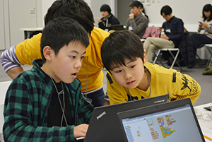 自由制作では、先ほどまとめたアイデアシートを参考にしながらイメージをプログラミングで形にしていきます。分からない部分はお友達に相談したり、グループについているファシリテーターの方も一緒に考えたりしながらつくり込んでいきました。今回は女性の参加者も多く、桜の花びらやキノコ、ペンギンなどこれまでのワークショップではあまり出てこなかった世界観のアイデアが沢山出ていたのでどのようなゲームになっていくのかとても楽しみです。