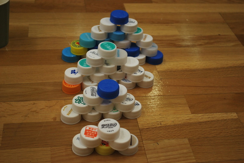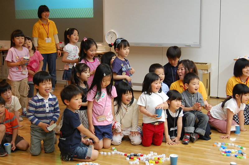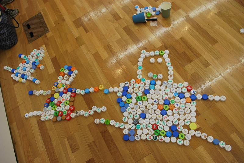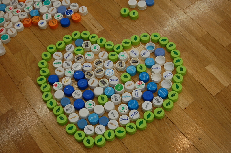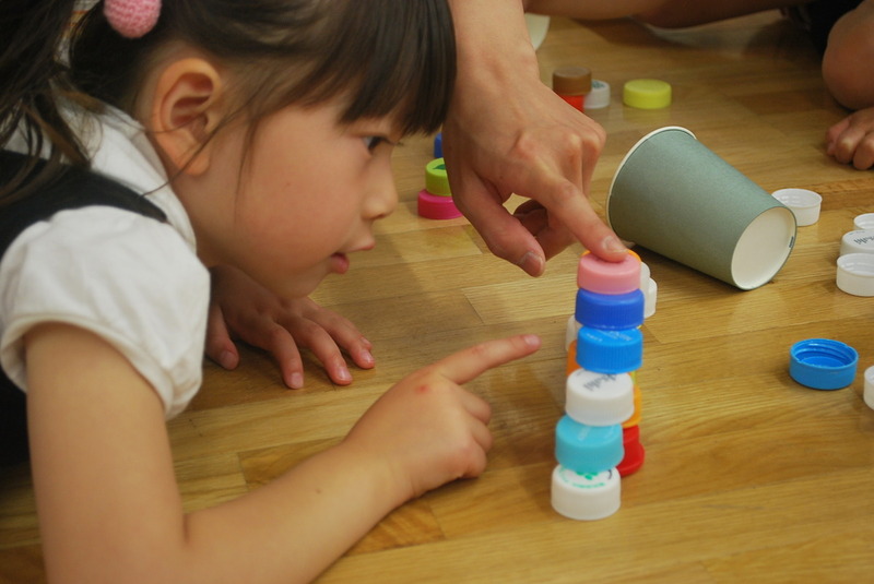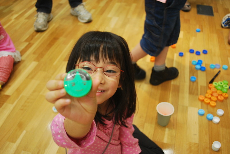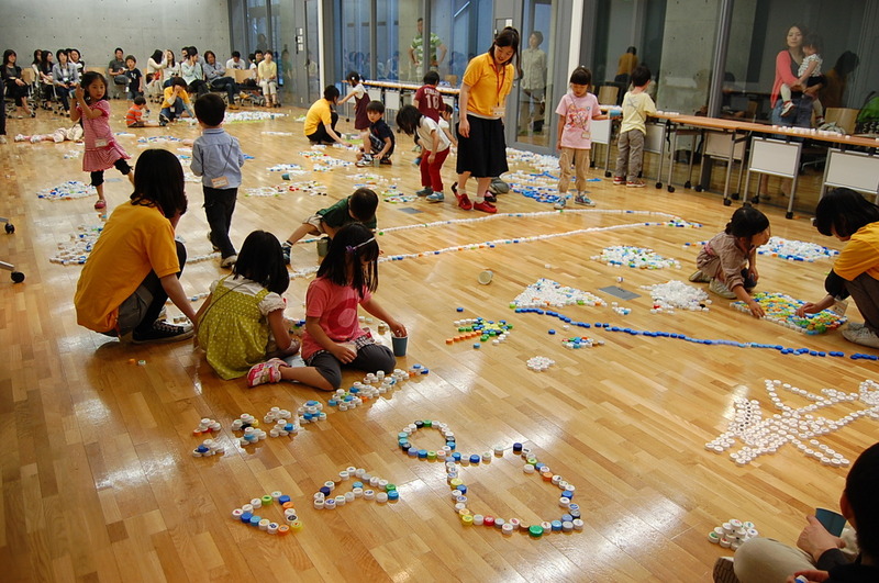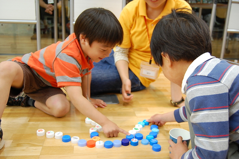 2011年5月15日(日)「キャップ10.000個の造形」(幼児クラス)in東大 研究所に、ペットボトルのキャップが10,000個!さわって、つんで、さがして、ならべて、ころがして!?たくさんのキャップで遊んでつくろう!