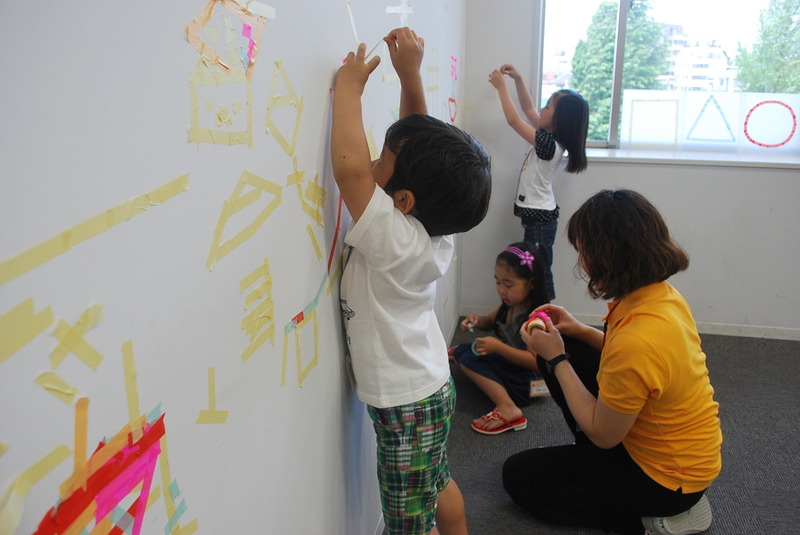 いろんなカタチや色をぺたぺた、ぺたぺた。しゃがんでぺたぺた、背のびしてぺたぺた。