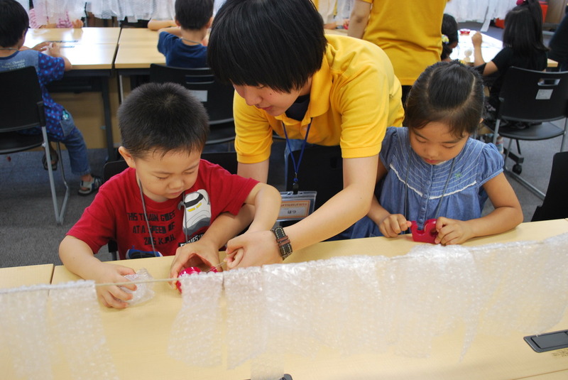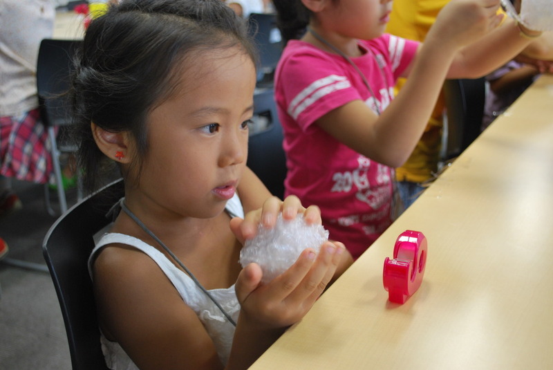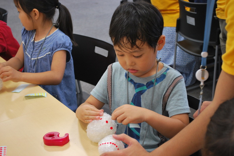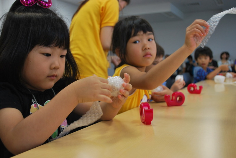2011年8月14日(日)「ぐるぐるエアパボール」(幼児クラス)in慶應日吉 エアーパックをぐるぐる、ぐるぐる、丸めて、丸めて。 1枚の大きな平面の素材から、まん丸のボールをつくってみよう! どんなボールができあがるかな?!
