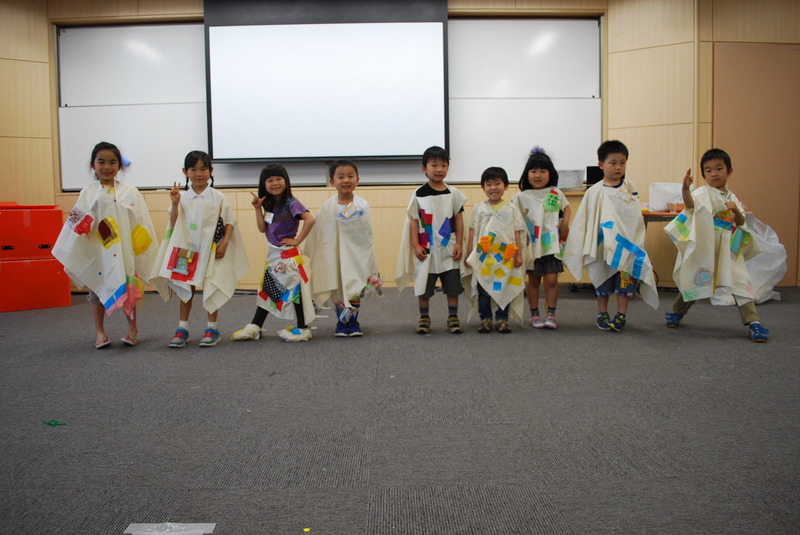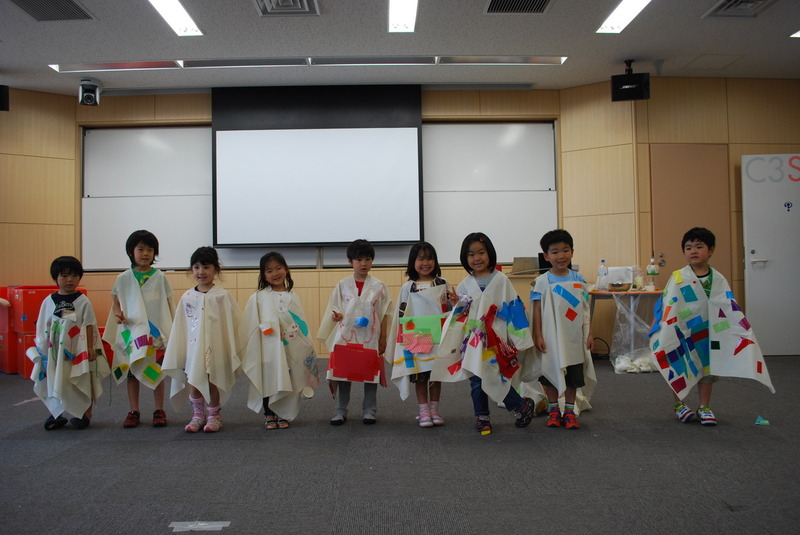 2012年5月27日(日)「おおきなふくをつくる」(幼児クラス)in慶應日吉 おおきな服をキャンバスに、お絵かきしてみよう! みんなの服は、どんな見た目、着心地?完成した作品を着て、慶應大学のキャンパスでファッションショー!?