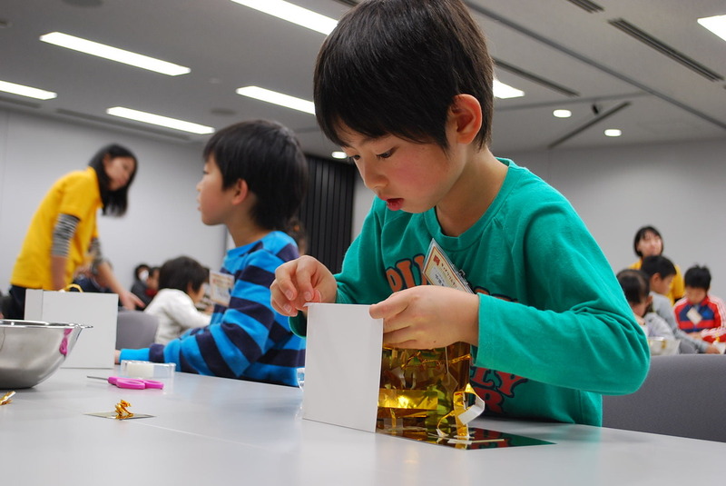2013年12月8日(日)「ミラーボックスでつくってあそぶ」(小学生クラス)in明治 かがみにうつったものは、ゆがんでる?逆さま?たくさん見える?かがみの箱の中に、複雑なカタチの世界をつくってのぞいてみよう。