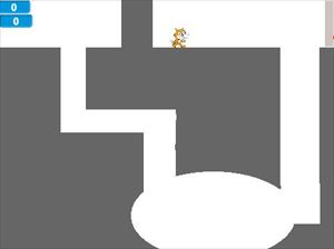このゲームは、迷路のようなコースを矢印キーと音センサーでネコを操作しながら進でいくゲームです。音を出すと上に移動するので上手く音センサーも使わなければゴールには行けません。光センサーで暗くするとビームを発射できるようにもなっていて、次は、ゴールにたどり着いた時ビームで壁を壊して次のステージに進めるように発展させたいと次の計画も語ってくれました。 |