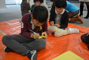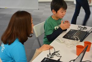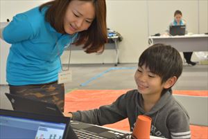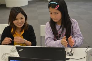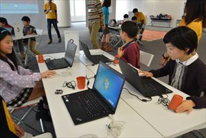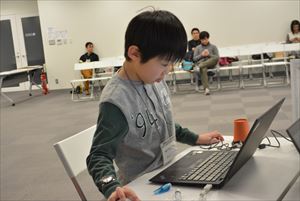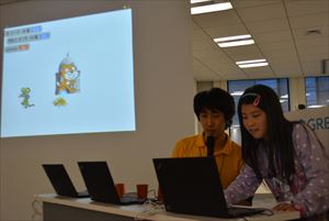 | ●自由制作 アイディアシートを参考にしたり、時にはつくりながら思いついた新しいアイディアを追加してゲームを形にしていきます。スクラッチでゲームをつくったことはあっても、光や音を使った命令を使うのは皆さん初めてだったので最初は苦労するかと思っていましたが、グリーの社員の方、ファシリテーターの方々に質問したりヒントをもらいながら着々とゲームを形にしていました。こまめに休憩をとったり、体操で体を動かしながら最後の作品発表に向けてとても集中していました。 |