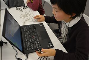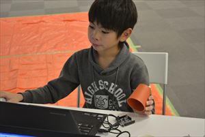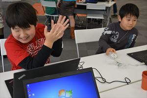 次は、光と音をコントローラーにするために使うなのぼ~どAGについて知ることからスタートです。なのぼ~どAGには光センサー、音センサーなどがついているセンサーボードで、パソコンにつなぐことでスクラッチのブロックを使って制御することが出来ます。接続方法、注意点などを確認しながらなのぼ~どAGとスクラッチをつないでいきました。 光センサーは明るさを、音センサーは音の大きさをスクラッチ上で数値化して見ることが出来るので、その数値を応用して手で光をふさいだり、大きな音を出したりしてゲームを操作できます。 今回は、光センサーを使って紙コップで光の強さを調節しながら実際につかまえるようなしぐさで画面の中の昆虫をつかまえるゲームと、音センサーを使って手を叩いて防御や攻撃を切り替えながら小さな魚が大きなサメを退治するゲームで遊び、どのようなことが実際に出来るのかをイメージしてもらいました。 |