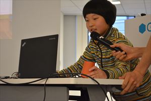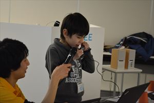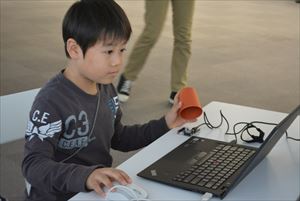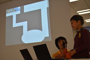 | ●プレゼンテーション 最後に、自分のつくった作品を会場の大きなスクリーンを使って発表会をしました。工夫したところや、光と音をどのようにゲームに応用したのか、もっとやってみたいことなどを前に立って堂々と発表していました。音センサーを使って声の大きさに反応してビームを発射しバナナをネズミから守るゲーム、光センサーを使った明るさによって色を変えながら敵をすり抜けてゴールするゲームなどお友達のアイディアにも歓声があがるほど面白いゲームばかりで大盛り上がりの発表会となりました。 |