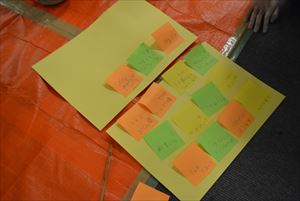 光と音をコントローラーにした時どんなゲームをつくってみたいか、本格的に制作に入る前にグループでアイディアを付箋に書き出しました。自分のアイディアを出しているうちに、お友達のアイディアとミックスされてどんどん新しい発想が生まれているようでした。沢山出たアイディアの中からこの後の自由制作でつくる作品イメージに合わせてアイディアシートをつくり、どのようなゲームにしていくかゴールも可視化します。 |