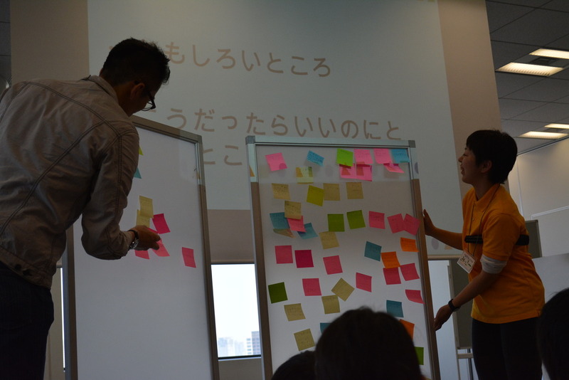 ゲームで遊んだあとは面白いところ、自分ならもっとこうする、など気づいたことを付箋に書いて張り付けていきます。 「シンプルでよかった」、「ライフをつけたい」、「タイマーをつけたら難しくなりそう」、「デザインを変えたい」などたくさんの感想、アイディアがでました。 |