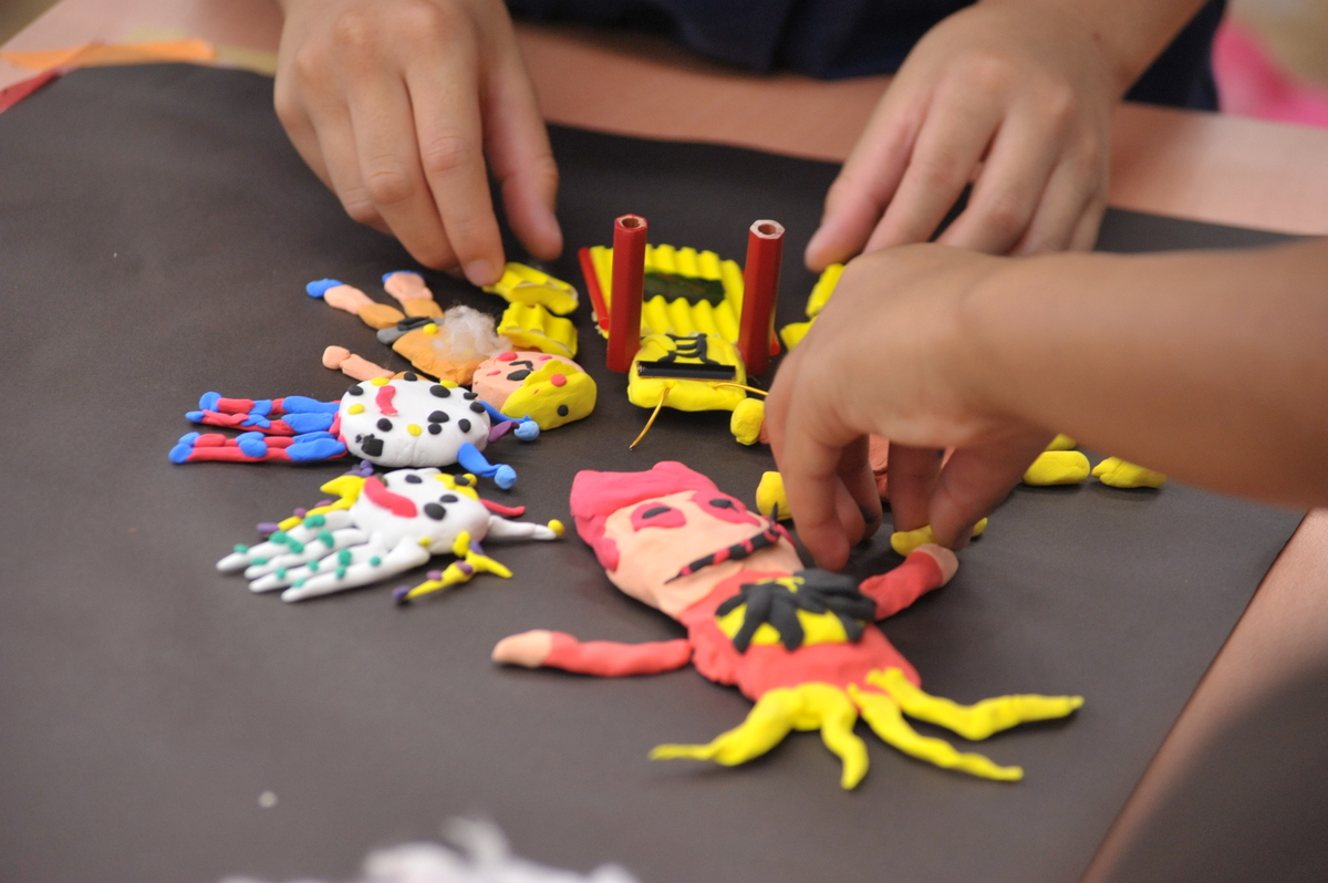 粘土をつかって、キャラクターをつくります。 キャラクターだけでなく、おはなしの背景や小物もみんなですべて作りました!