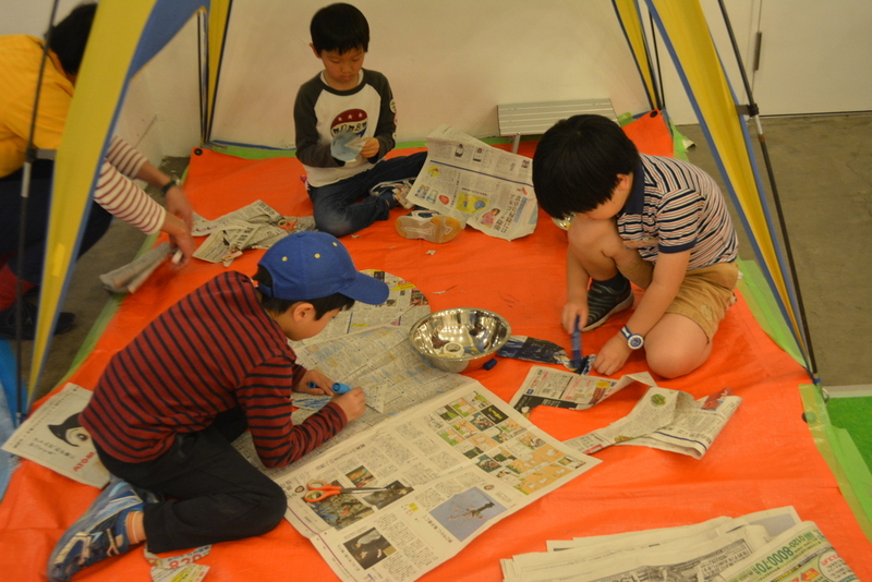 今回は研究所の中に紙だけで「キャンプ」をみんなでつくります!