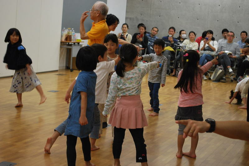 ストウさんのまねをして手をたたいたり、会場を動き回ったりして体をあたためます。