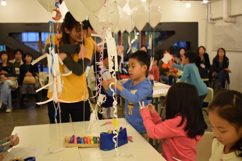 お猿さんがまるでぶら下がっているようになったり、雲が浮いているようになったり、ヒモの部分のどこにつけるのかを工夫していくと、風船の中にストーリーが生まれてきます。オリジナルのキャラクターや、風船につけたら面白そうな生き物を工夫して作っている子もいました。