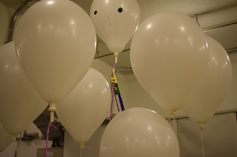 お部屋に入るとたくさんの白い風船がプカプカと並んで浮いています。