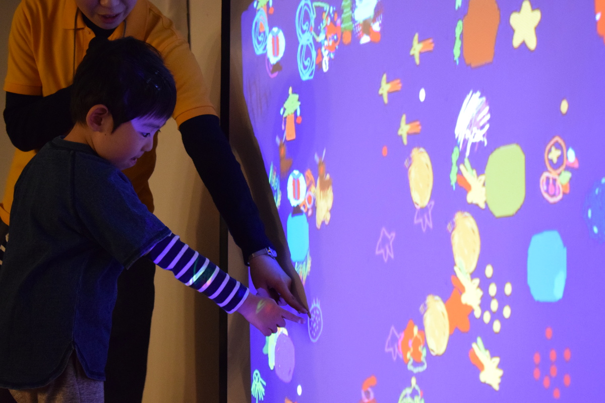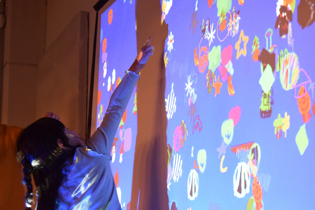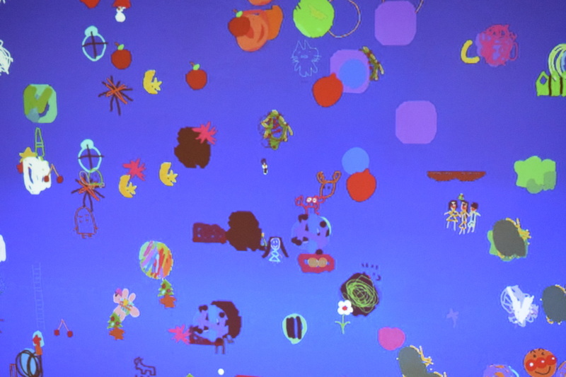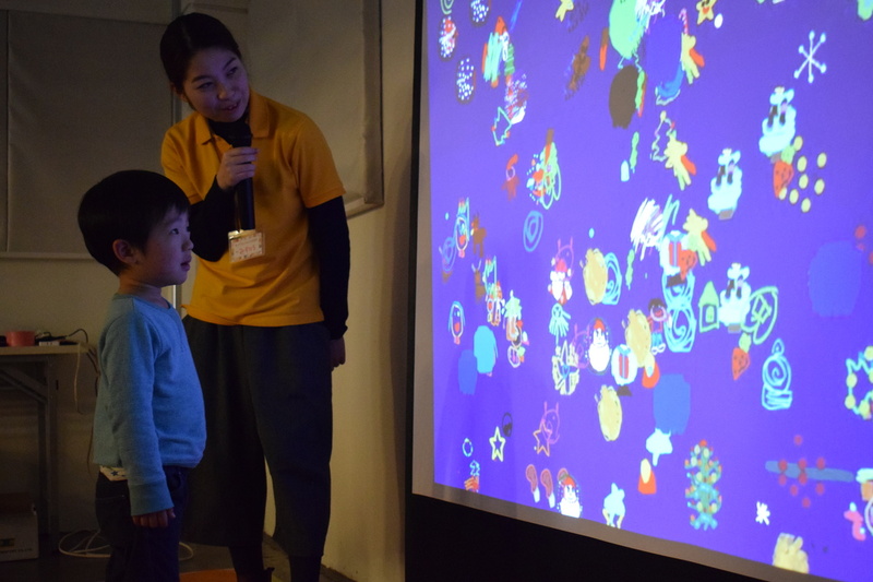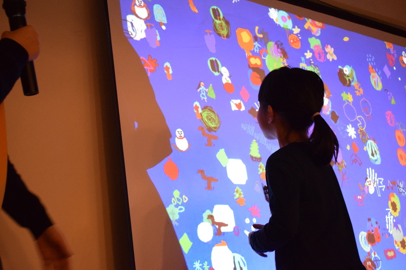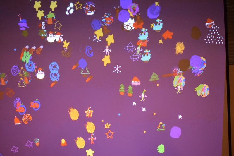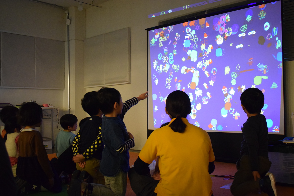 ipadで送ってしばらくすると、大きなスクリーンに自分の絵が登場!プログラミングした絵がスクリーンの中で動き回っている様子に子供たちは大喜び。自分の手元から離れることで、より生きているように感じました。