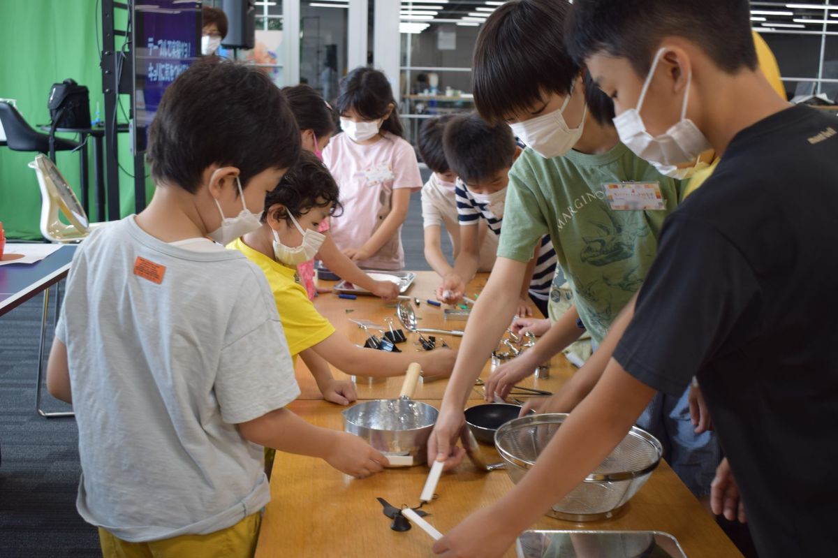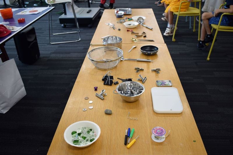 机の上に並んだいろいろな道具や素材の中から磁石にくっつくものを探していきます。