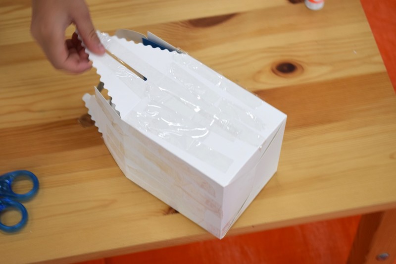 白い箱を組み立てて、セロハンテープをたくさん切って、