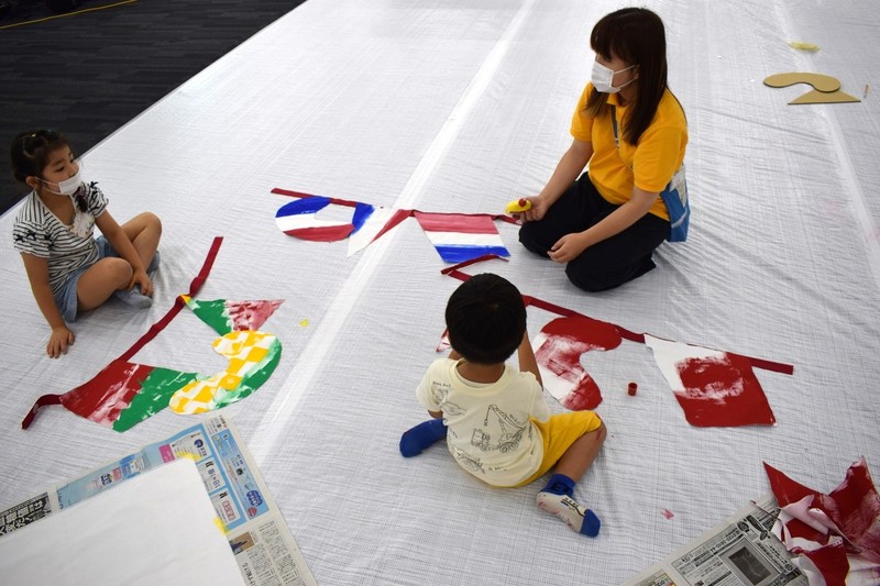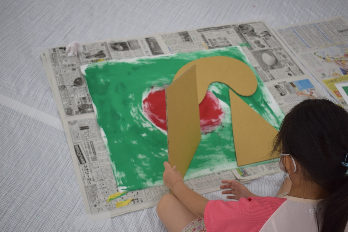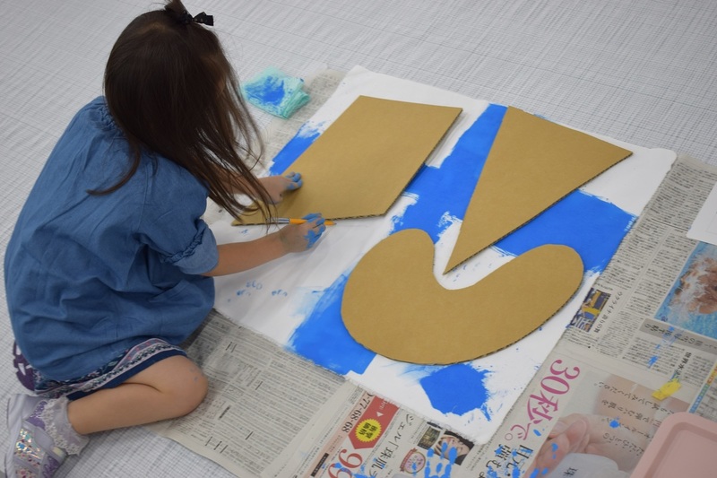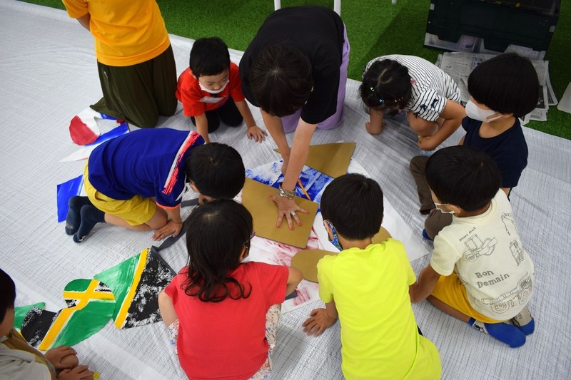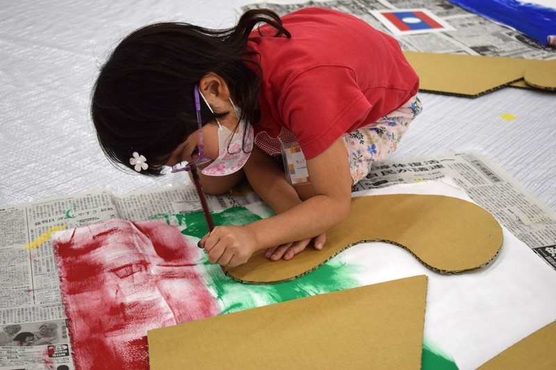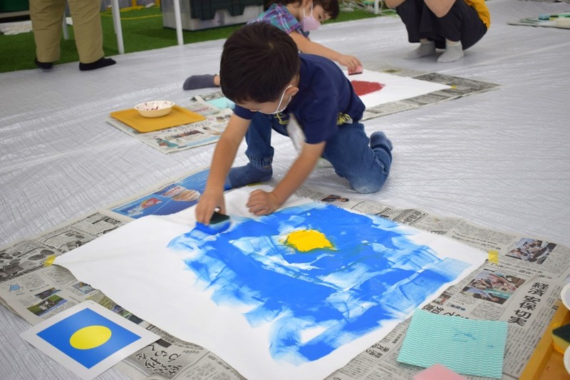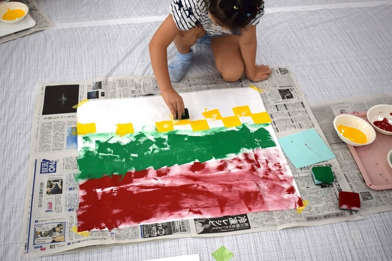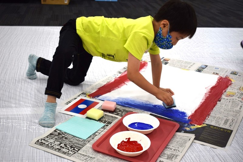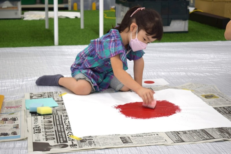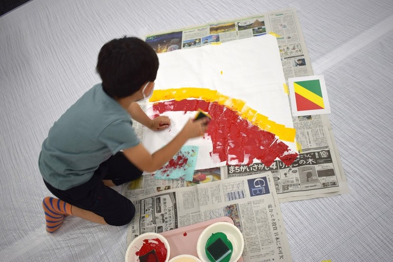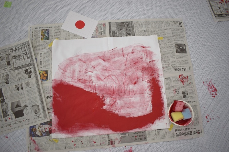 えのぐとスポンジで、大きな布に自分が選んだ国旗を大きく描きます。