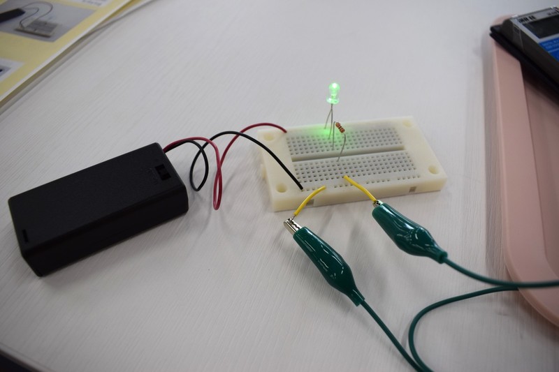 ワニ口クリップがはなれたままだと、LEDは光らない。