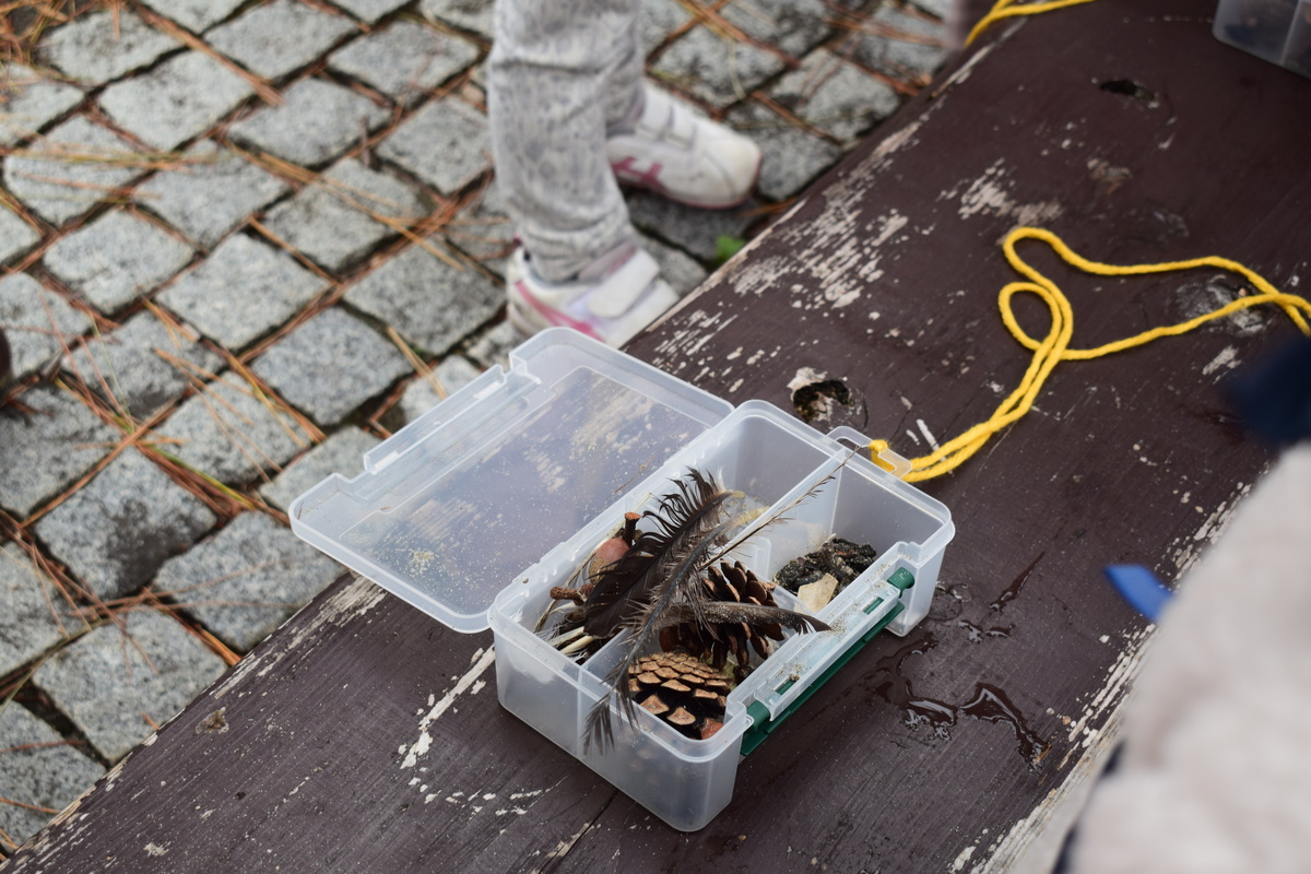 グループに分かれて、一つの箱に見つけた秋のいきものを入れていきます。