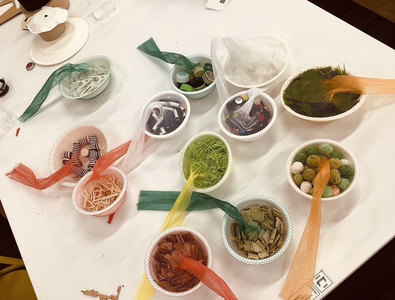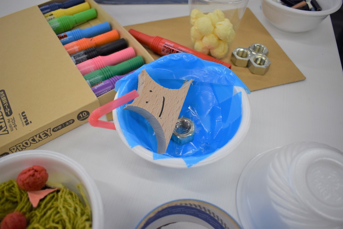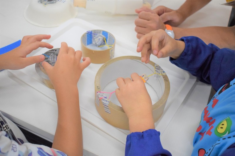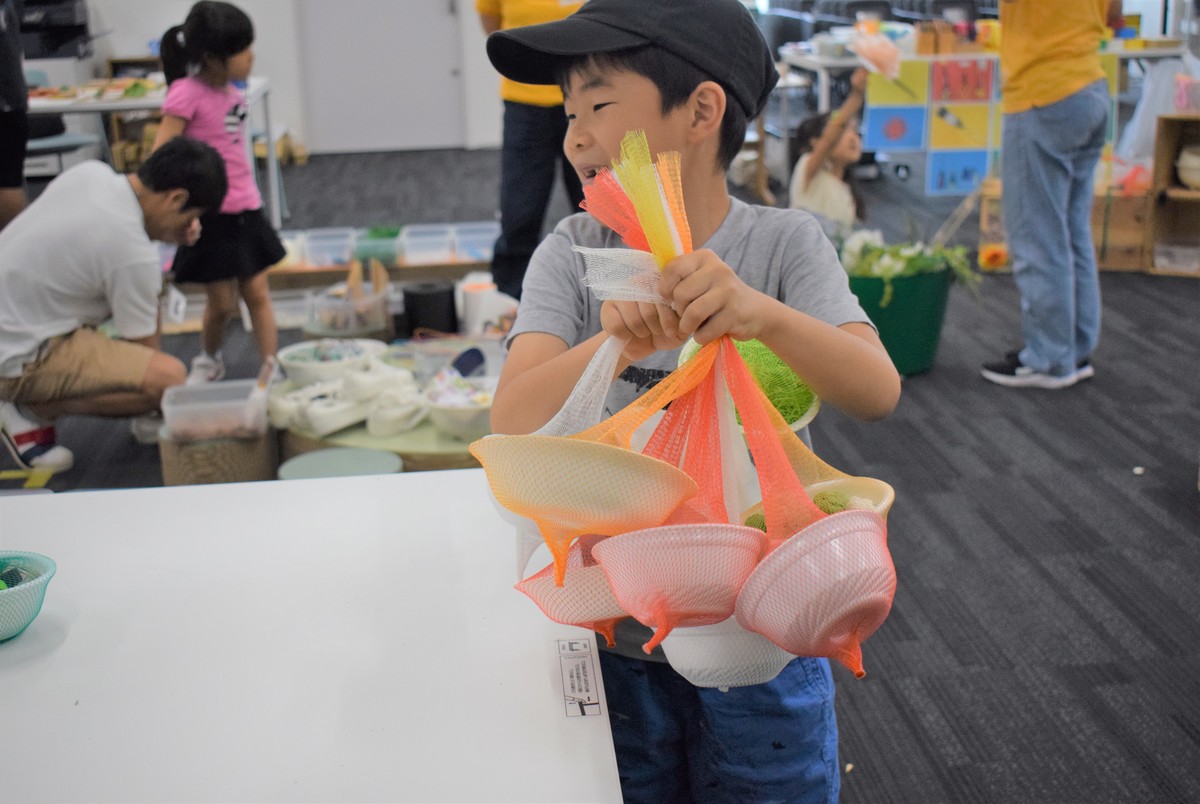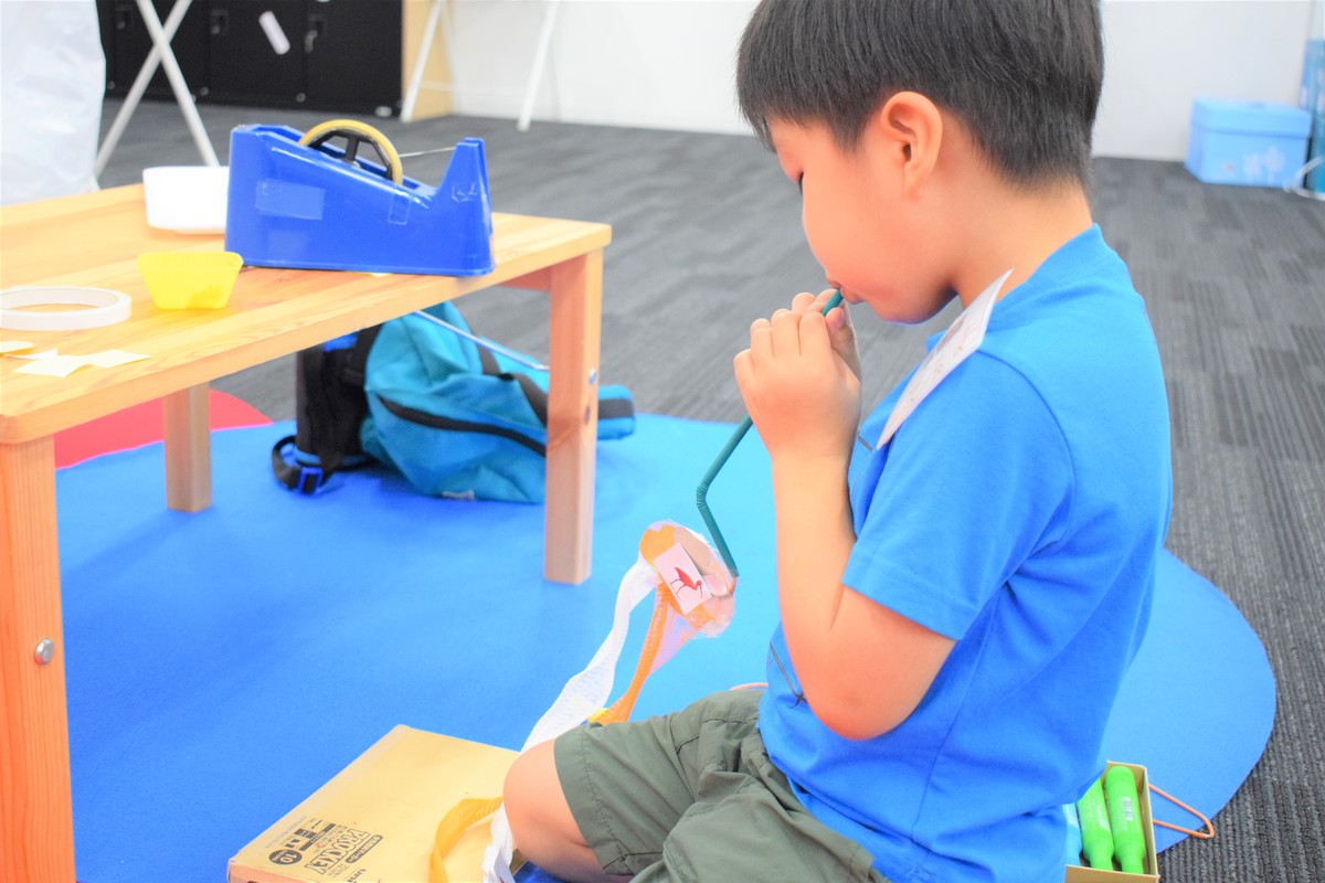 みかんネットにストローをつなげて、空気を入れているこどもがいました。