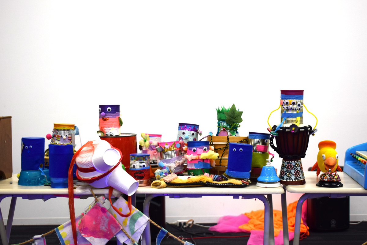 サウンドモンスターは、みんなの身近なものの廃材などからできています。
