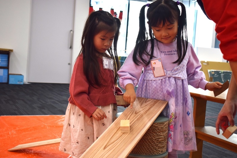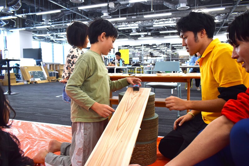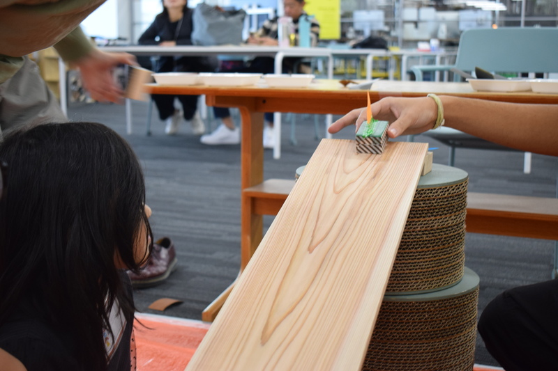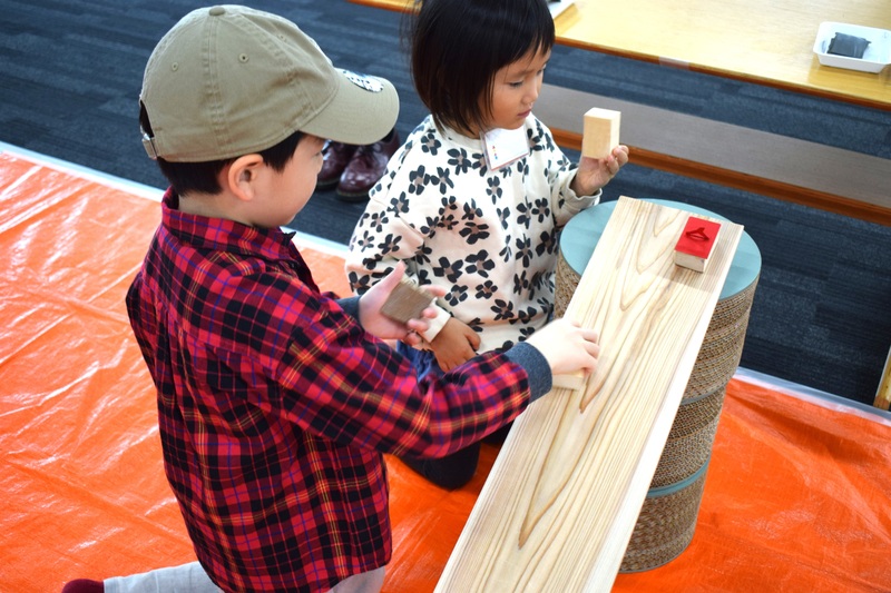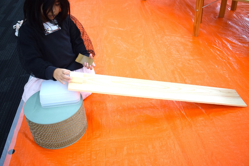 今日は木の板をすべらしていくんだけど、どんな風にすべるかな?