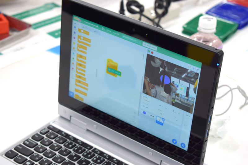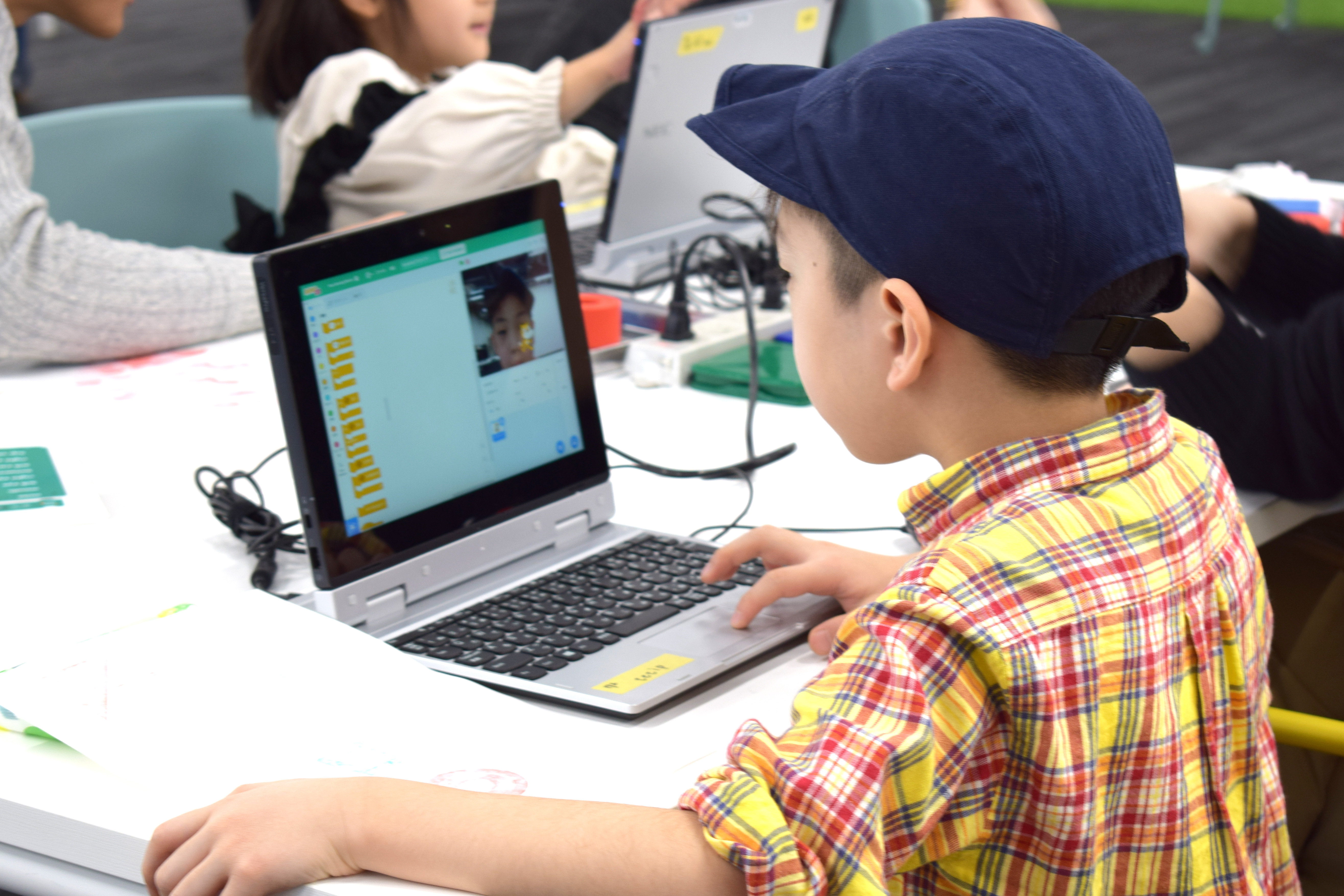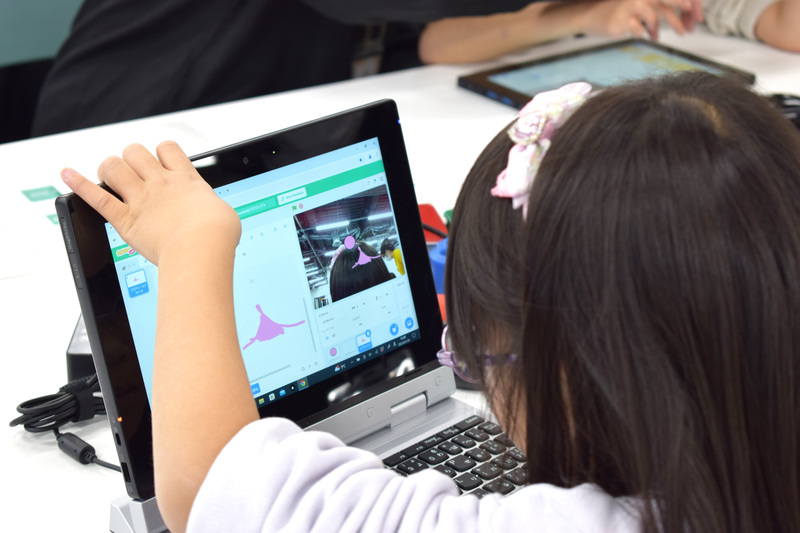 それに今日はScratchのステージがパソコンのカメラとつながって自分の顔が映っているよ。
