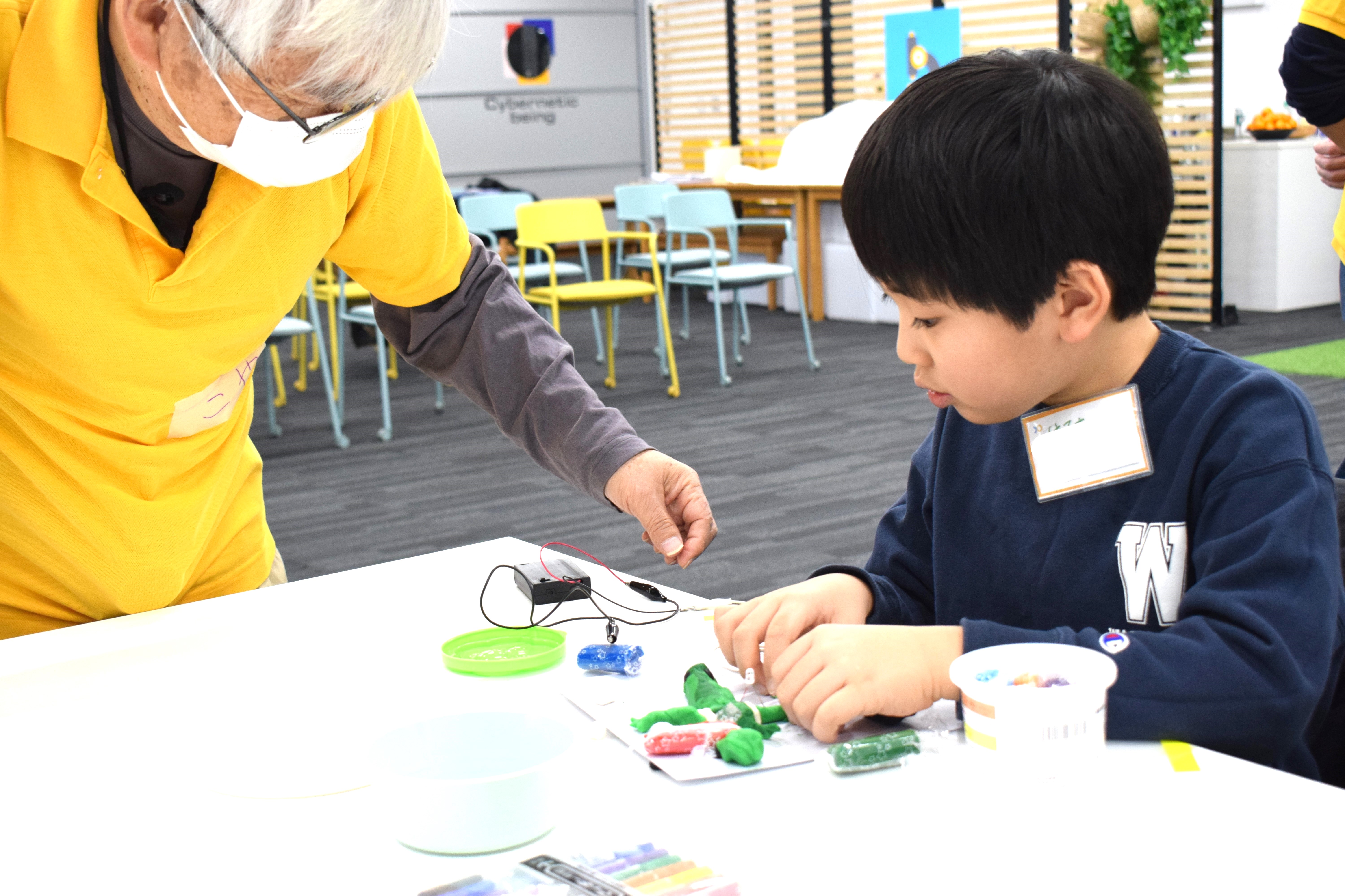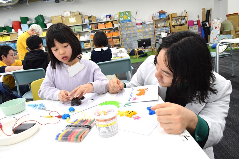 芸人リーダーのYOUⅡから「魔法の粘土」をもらって、電気が通る仕組みをつくったら、今日の工作のスタートです。