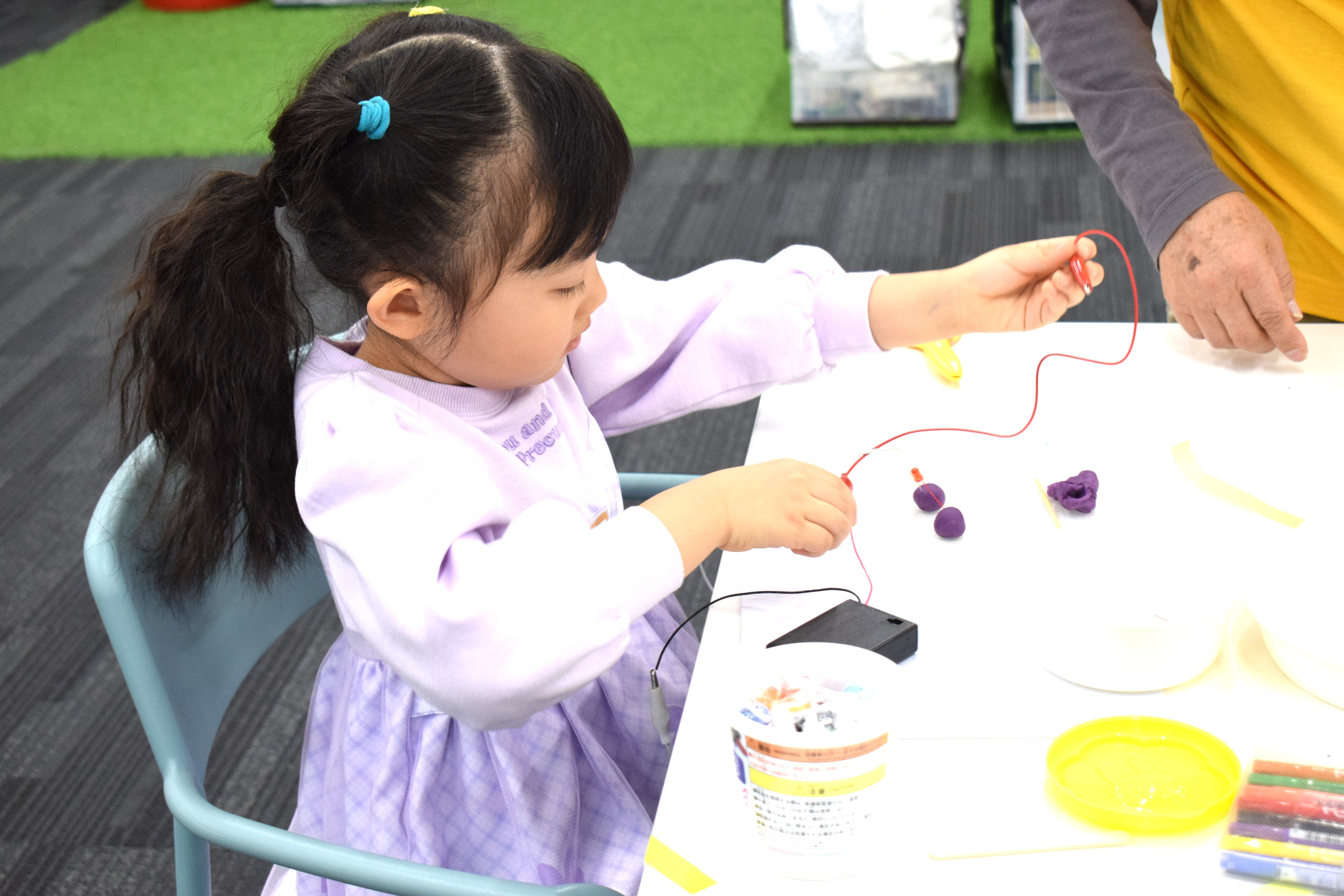 LEDの足に粘土をつけて、電池ボックスに繋げてみよう。