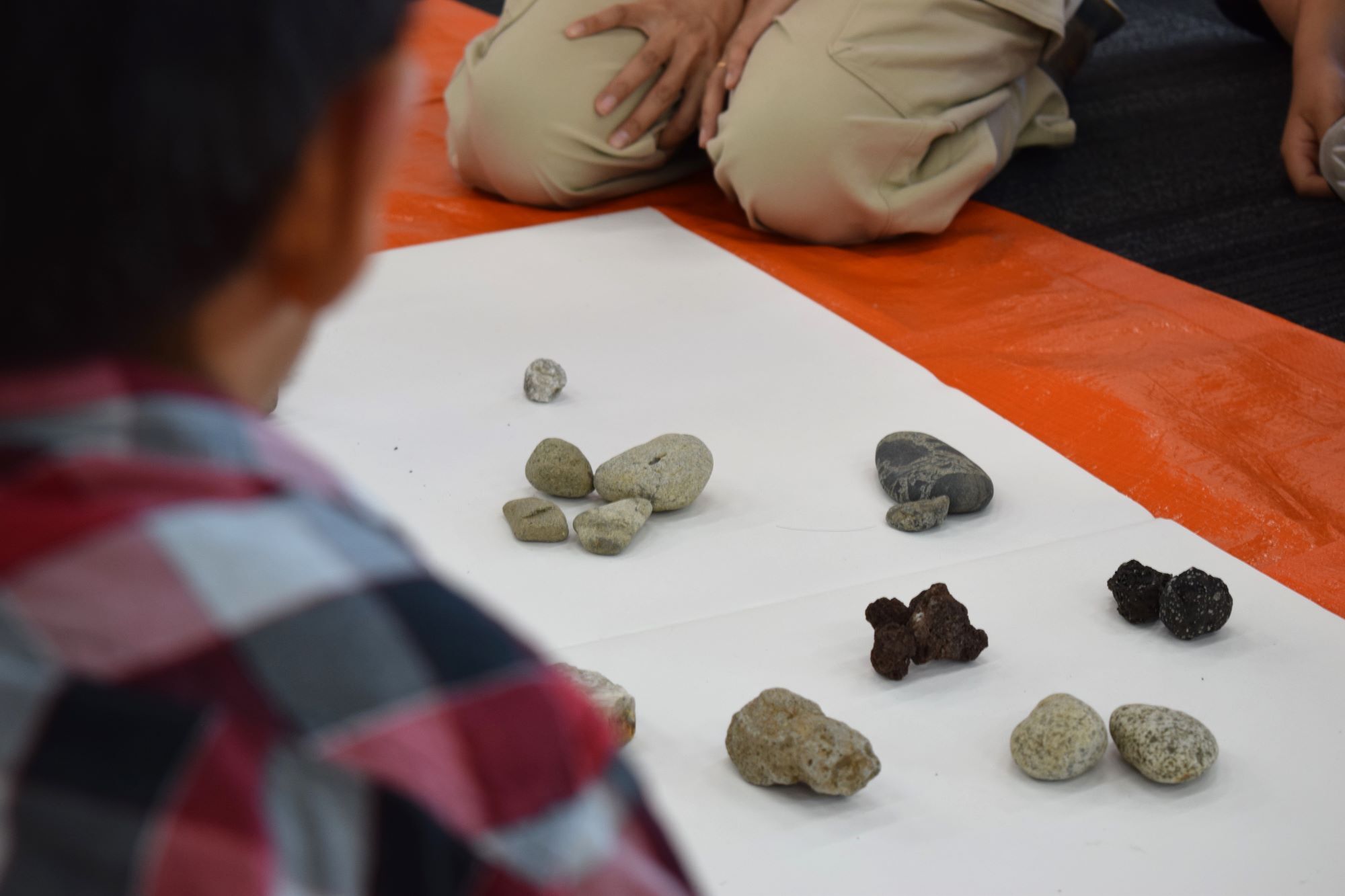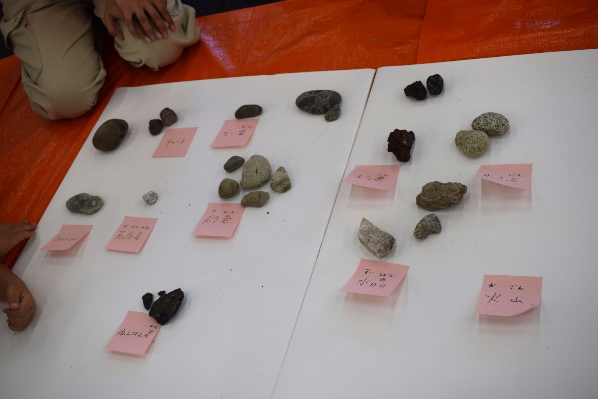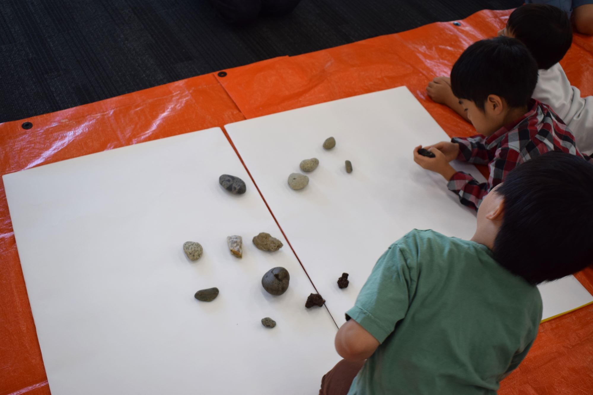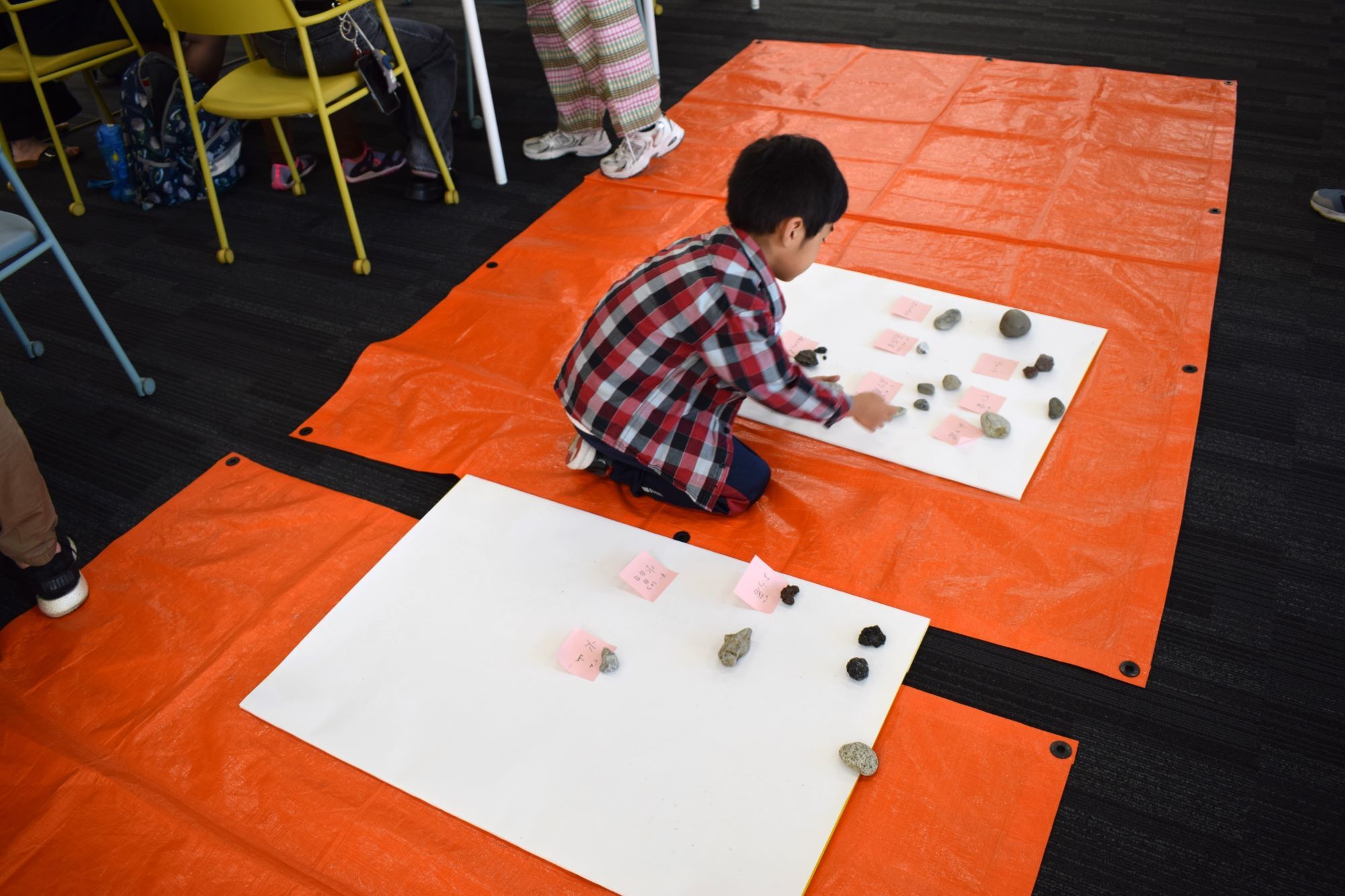 今日はみんなは石の調査員。まずはここにどんな石があるか分類してみよう!