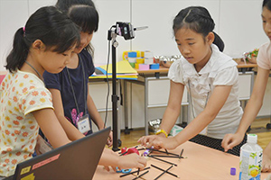 パソコンとカメラをつかって、1枚1枚、コマ撮りをします。つくった粘土のキャラクターをアニメにする大事な作業です。